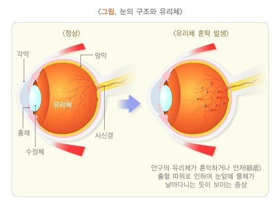눈 안에는 유리체가 가득 채우고 있다. 유리체는 수정체와 망막 사이의 공간을 채우고 있는 무색투명한 젤리 모양의 조직이다. 이 유리체의 투명도가 유지되어야 명확한 시력이 가능하다.