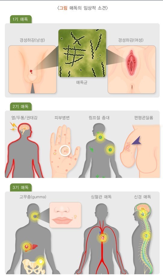 2기 매독은 피부 발진과 점막의 병적 증상이 특징이다. 3기 또는 후발 매독의 증상은 주로 내부 장기의 손상으로 나타나며 중추신경계, 눈, 심장, 대혈관, 간, 뼈, 관절 등 다양한 장기에 매독균이 침범해 발생한다.