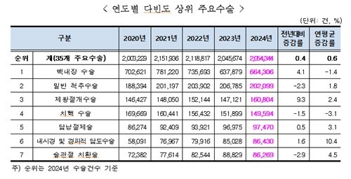 지난해 상위 35개 주요 수술 건수는 205만4천344건으로 전년 대비 0.4% 늘었다. 지난 5년간의 연평균 증가율은 0.6%였다.