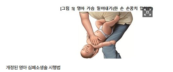 영아의 기도에 이물질이 들어가 폐쇄된 경우에는 내부 장기 손상에 대한 우려로 복부 압박이 권고되지 않는다. 이번 개정판에서는 기존의 등 두드리기(5회), 복부 밀어내기(5회)에 더해 한 손 손꿈치(손바닥과 손목 사이) 압박법을 시행할 것이 권고됐다.