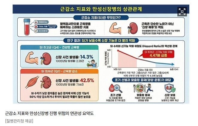 연령, 고혈압·당뇨병 등 기저질환을 고려한 분석에서도 근육량이 가장 많은 환자 대비 가장 적은 환자에서 신장 기능 악화 위험이 약 4.47배 높았다.