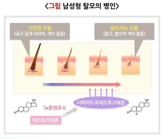 머리카락은 보통 3~6년 정도 자란 후에 빠지게 되고, 빠졌던 바로 자리에 3개월 후에 새로운 머리카락이 자란다. 그러나 탈모 환자의 경우 새로운 머리카락이 충분히 자라지 못하고 퇴행기와 휴지기에 들어간다.