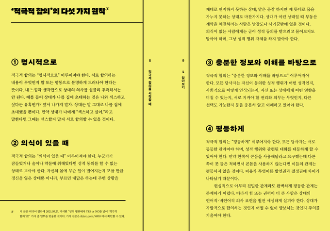 여기서 제시한 ‘적극적 합의’의 원칙은 다섯 가지다. ①명시적으로, ②의식이 있을 때, ③ 충분한 정보와 이해를 바탕으로, ④평등하게, ⑤모든 과정에서 항상 확인하기다.