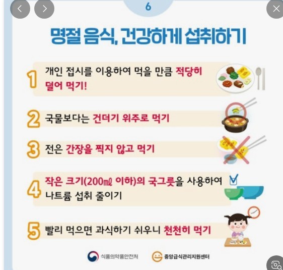 명절 음식부터 조심해야 한다. 명절 음식은 대체로 고열량, 고지방에 콜레스테롤이 많으므로 무엇보다 과식을 삼가야 한다. 나물은 기름에 볶기보다는 데치는 조리법, 육류는 기름기 제거 후 삶는 조리법이 건강에 이롭다.