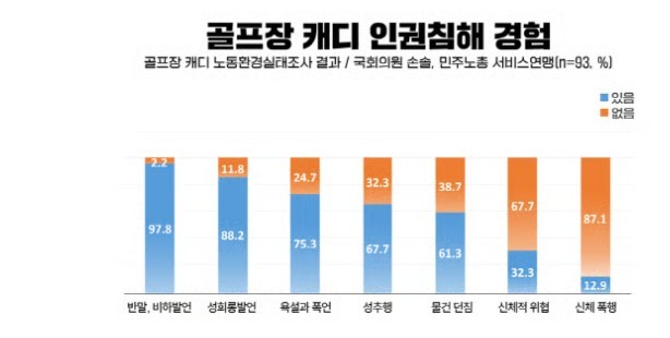 거의 모든 캐디가 고객한테 언어폭력을 경험했다. 반말·비하 발언 경험은 97.8%, 성희롱 발언 88.2%, 욕설과 폭언 75.3%, 물건 던짐 61.3%, 신체적 위협 32.3%, 신체 폭행 12.9% 등으로 조사됐다.