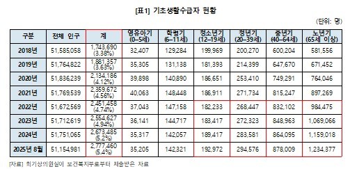 국회 기획재정위원회 소속 최기상 민주당 의원이 보건복지부로부터 제출받은 자료에 따르면, 2025년 전체 기초생활수급자 중 65세 이상 노인은 44.4%로 가장 높은 비중을 차지했다. 전체 수급자의 절반 이상이 60세 이상이다.