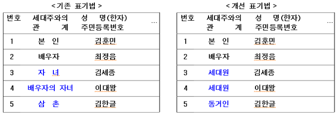 주민등록상의 ‘배우자의 자녀’ 표시가 9년 만에 ‘세대원’으로 바뀐다. 재혼가정에서 필요 이상의 가족관계 표기로 사생활이 침해되는 걸 방지하기 위한 것이다.