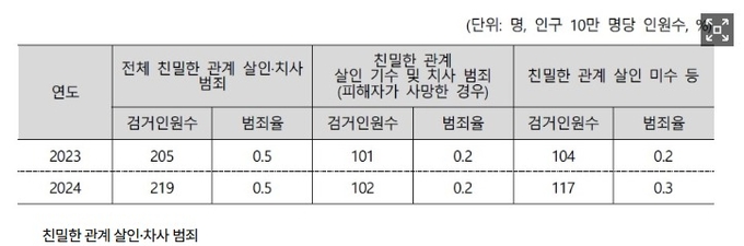 특히 이번 통계에는 범죄자와 피해자의 관계를 세분화해 친밀한 관계(사실혼 포함 전·현 배우자, 전·현 애인 등)에서 벌어진 살인·치사·폭력에 대한 현황 통계가 최초로 집계됐다.