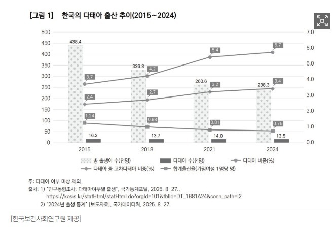 보고서는 한국의 쌍둥이 관련 정책이 주로 임신 중이나 출산 전후의 ‘사후 대응’에 집중돼 있다는 데 문제를 제기하면서, 다태아 출산이 산모·태아 건강 면에서 한 명만 낳는 단태아보다 더 위험하다는 점을 상기시켰다.