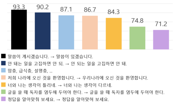 조사 대상 중 개선이 가장 필요하다고 지적된 항목은 ‘말씀이 계시겠습니다’, ‘이 제품은 품절이십니다’처럼 사물이 주어인데도 ‘시’를 넣는 과도한 높임 표현이었다. 응답자 93.3%가 ‘바꿔야 한다’고 답했다.