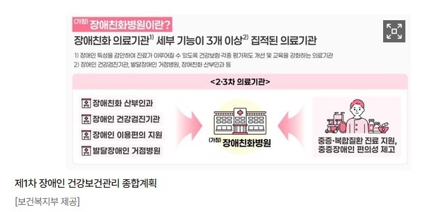 정부는 장애친화 의료기관을 시도마다 1곳 이상으로 확충할 계획이다. 이와 함께 산부인과, 검진 등 장애친화 의료기관의 세부 기능이 3개 이상 집적된 의료기관을 장애친화병원으로 지정한다.