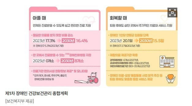 장애인이 아파도 제때 진료받지 못하는 상황을 고려해 정부가 시도별로 장애친화병원을 확충한다. 또 장애인이 살던 곳에서 회복·재활할 수 있도록 도와 입원 기간을 줄이고, 주치의의 방문 재활 등으로 건강관리도 돕는다.
