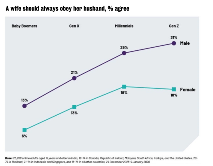 전 세계 Z세대(1996~2012년생) 남성의 31%가 ‘아내는 항상 남편에게 순종해야 한다’는 데 동의한다는 조사 결과가 나왔다. 베이비붐 세대(1946~1964년생) 남성의 동의 비율(13%)보다 무려 두 배 이상 높은 수준이다.