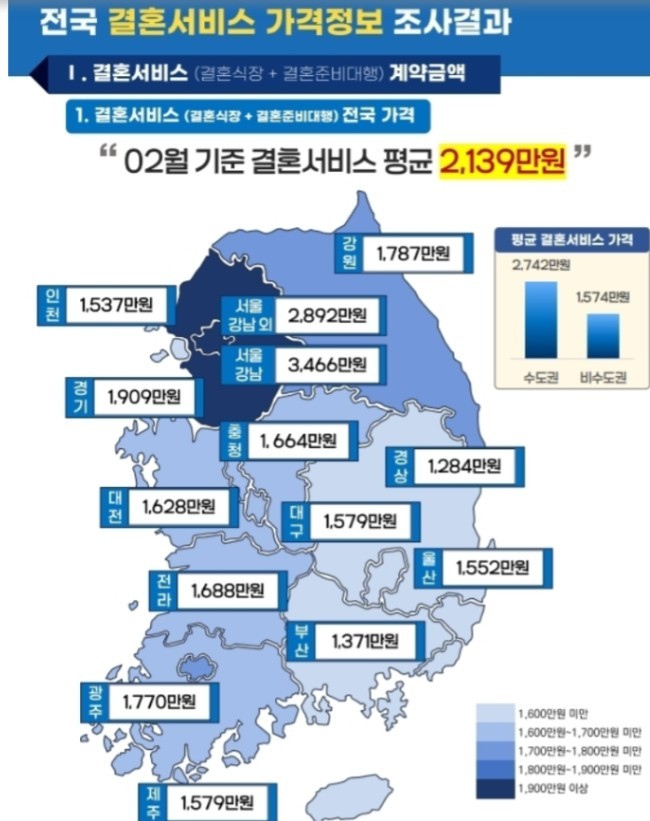 한국소비자원이 전국 14개 지역의 결혼서비스 비용을 조사한 결과, 지난 2월 기준 평균 비용은 2139만 원이었다. 지난해 12월과 올해 1월 두 달 연속 하락했던 흐름이 멈추고 다시 상승세로 전환된 것이다.
