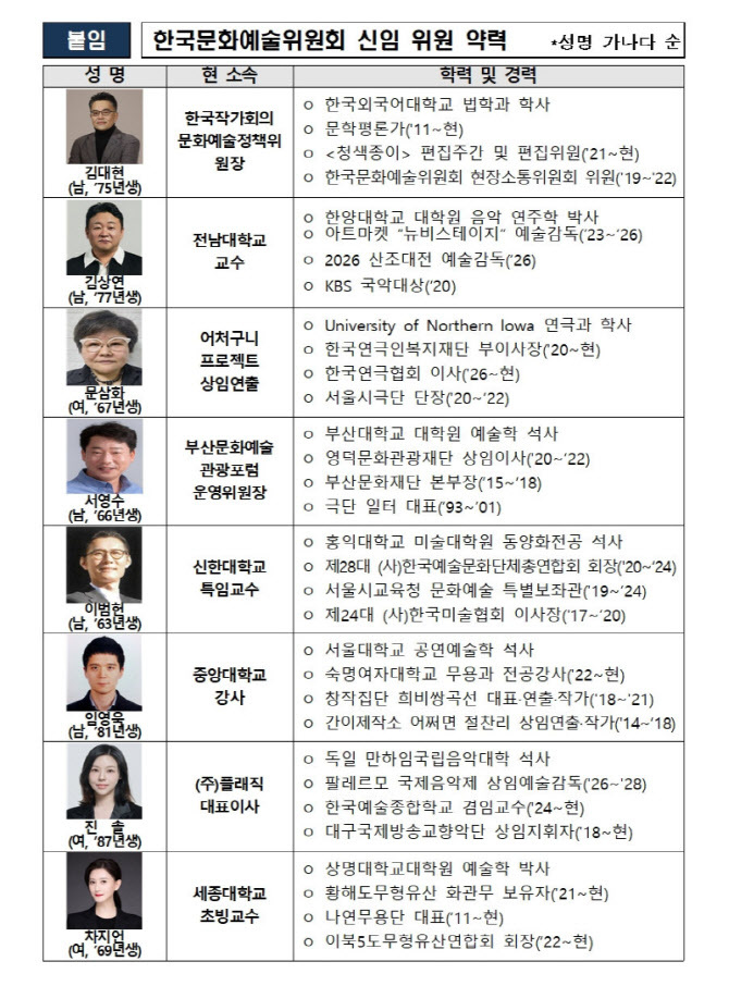 위원 선임 과정은 공개 절차를 거쳤다. 문체부는 2월부터 현장 추천을 받아 위원추천위원회를 구성하고, 공개 모집을 통해 후보군을 확보했다. 이후 심사를 거쳐 복수 후보를 추린 뒤, 대외 의견 수렴 과정을 거쳐 최종 위원을 확정했다.